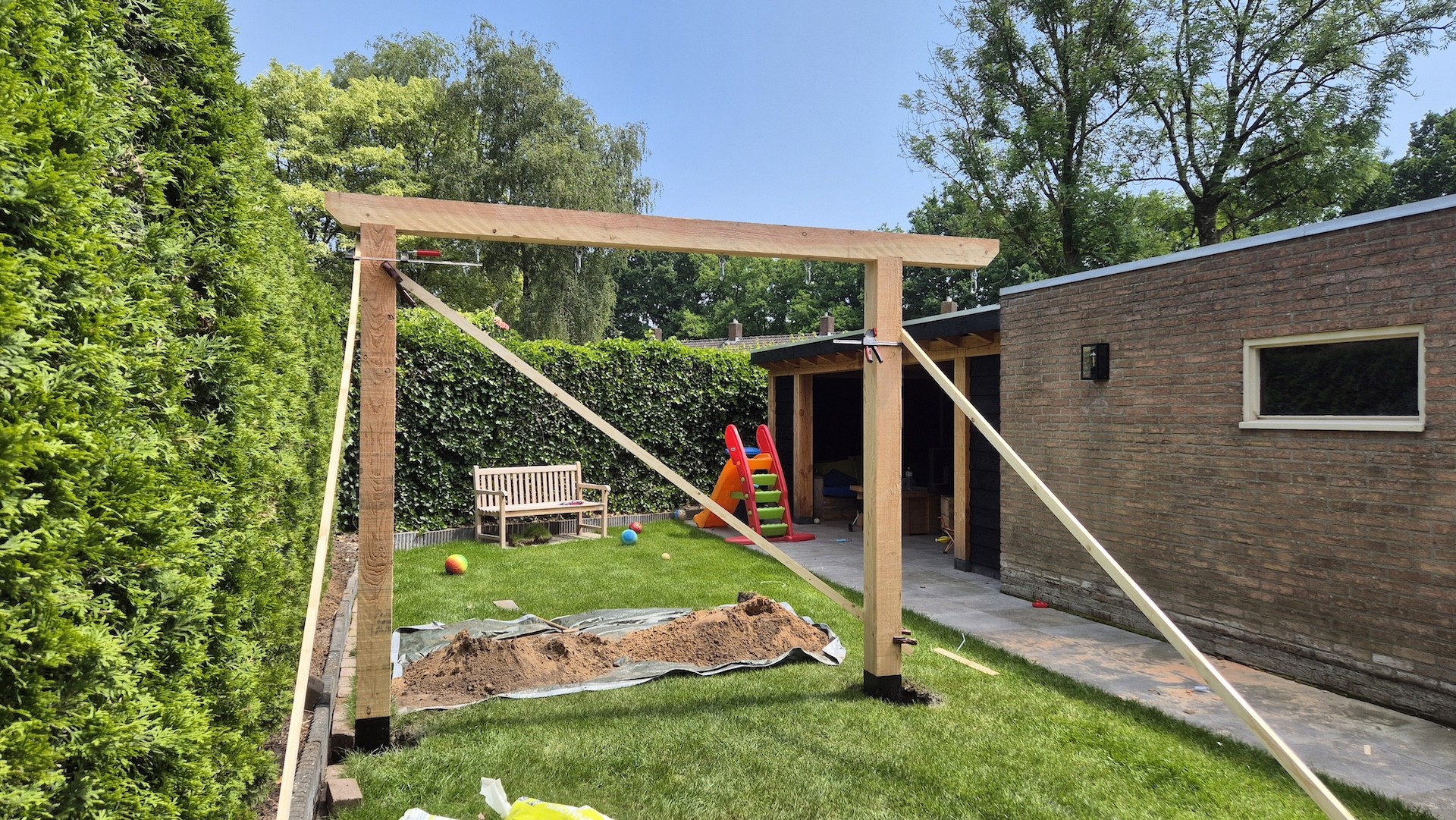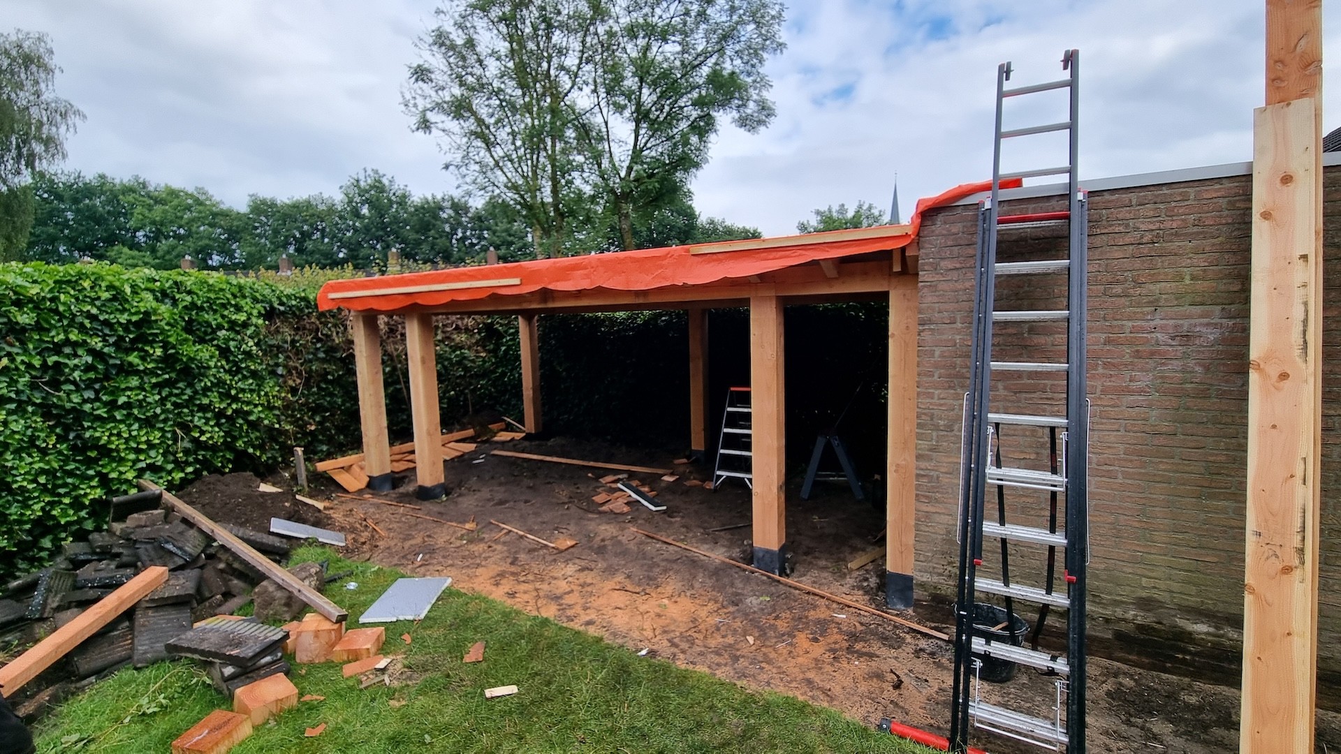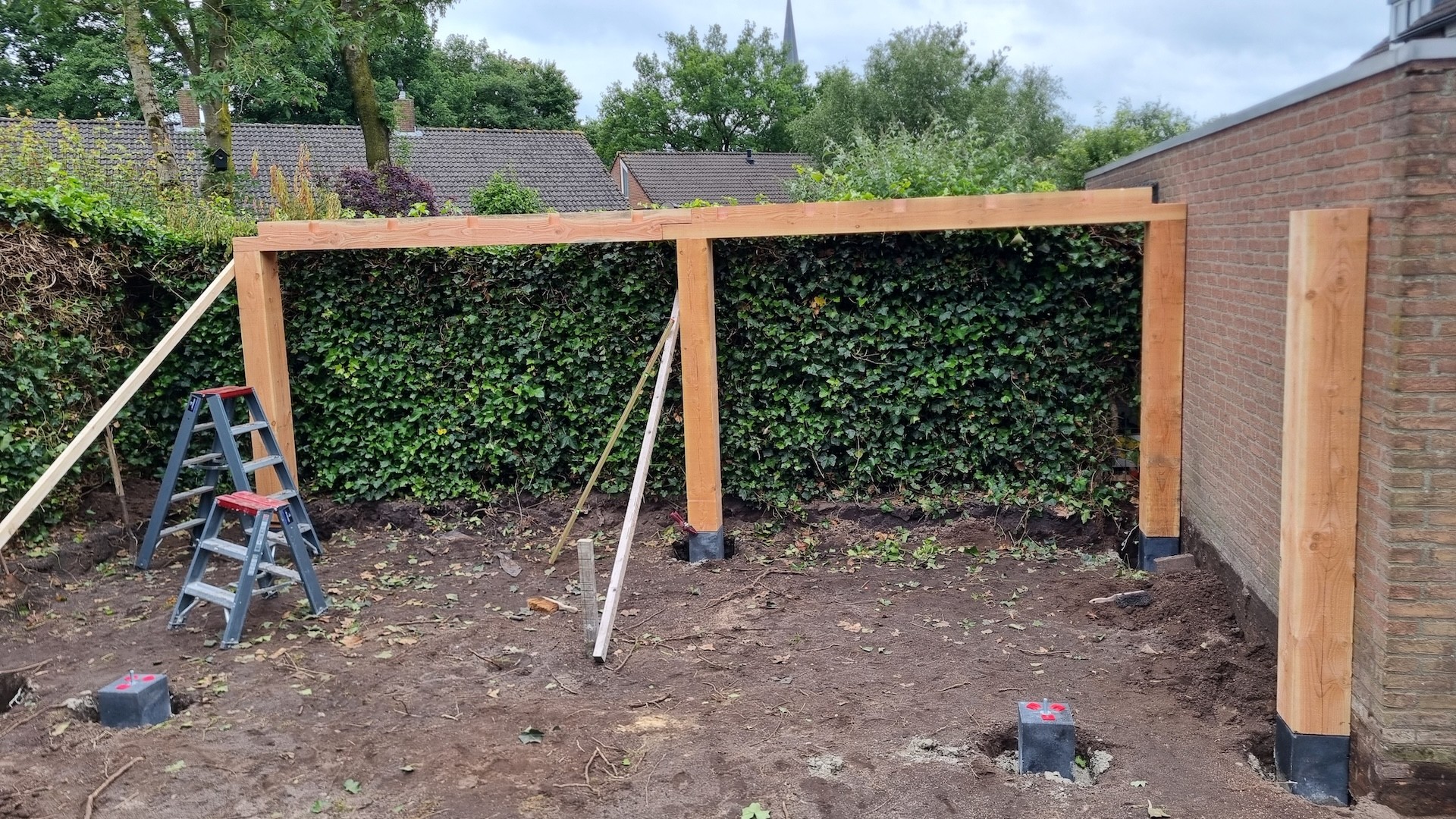 In Twello hebben wij een maatwerk veranda gerealiseerd die perfect aansluit op de bestaande tuin en woning. De constructie is opgebouwd uit robuuste houten staanders en liggers, wat zorgt voor een stevige en duurzame basis. De veranda biedt een beschutte buitenruimte waar het hele jaar door van de tuin genoten kan worden. Door de combinatie van hout met donkere gevelbekleding ontstaat er een moderne en warme uitstraling die mooi opgaat in de omgeving.